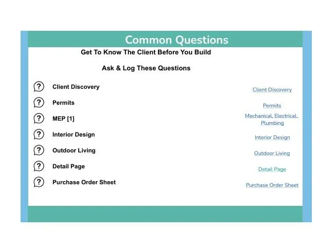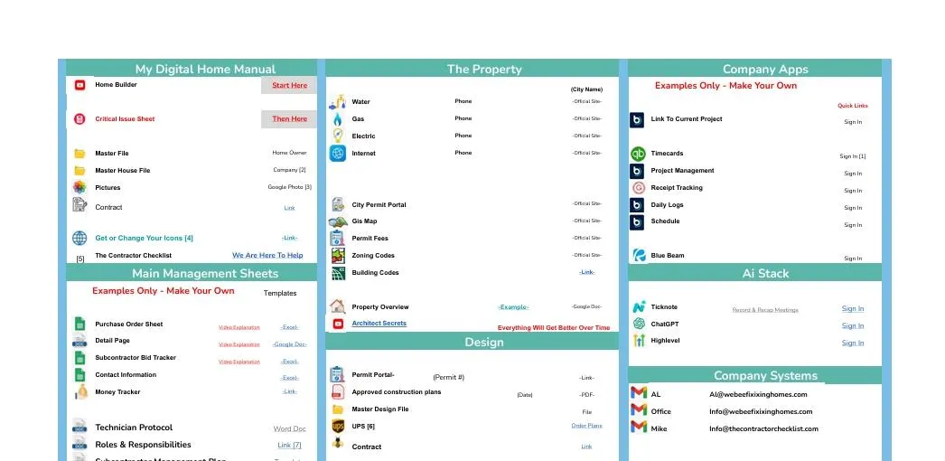 The Contractor Checklist is a structured system designed to help contractors and builders organize construction projects. It includes checklists, project documentation tools, subcontractor tracking sheets, and process templates that simplify construction management. Builders use the Contractor Checklist to stay organized, reduce mistakes, track project decisions, and manage residential construction projects more efficiently.