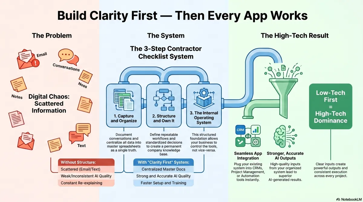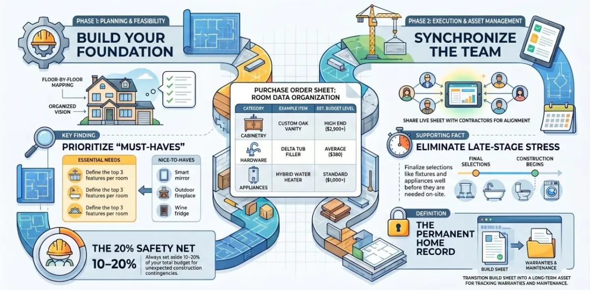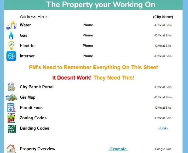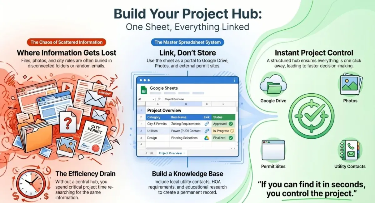 Instead of scattered emails, notes, and apps, everything is structured into a clear, step-by-step format using tools like Google Docs and Google Sheets. This creates a single source of truth that everyone involved—homeowner, contractor, architect, and project manager—can follow.